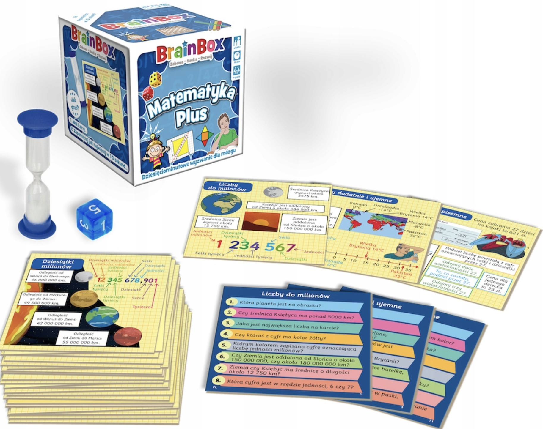 Twojemu dziecku niestraszne są podstawowe pojęcia matematyczne i szukasz czegoś, co pomoże mu nadal rozwijać wiedzę? BrainBox - Matematyka Plus to kolejny etap przygody w świecie liczb! Zajrzyj do pudełka i odkryj 55 kart służących do dynamicznej zabawy, a jednocześnie poszerzających wiedzę dotyczącą liczb pierwszych, kwadratowych, działań pisemnych, geometrii przestrzennej czy zaawansowanych miar i wag.
