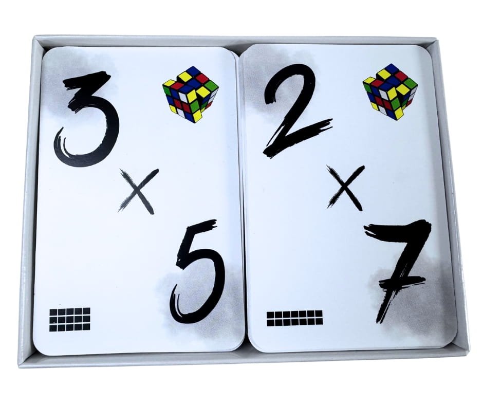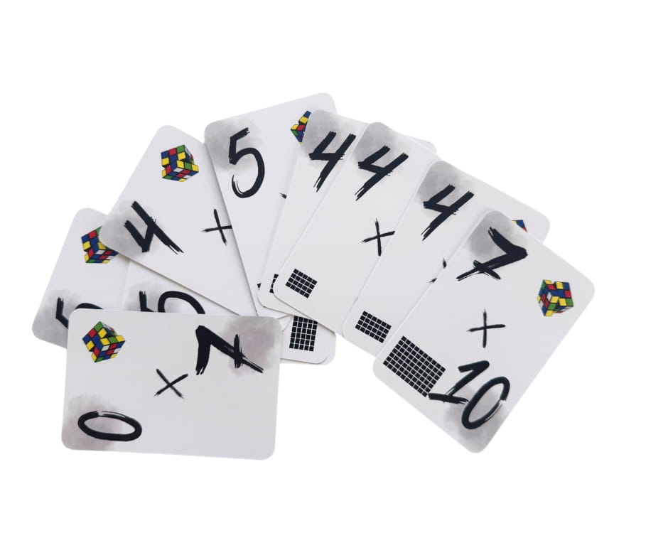 Każda karta zawiera działanie mnożenia (np. 8 × 9).