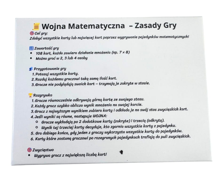Tabliczka Mnożenia – Wojna Matematyczna TALES to edukacyjna gra karciana, która pomaga dzieciom skutecznie opanować tabliczkę mnożenia poprzez zabawę i zdrową rywalizację. Dynamiczna forma gry sprawia, że nauka matematyki staje się przyjemna, angażująca i wolna od stresu.